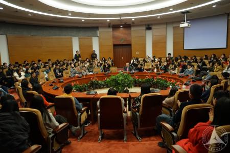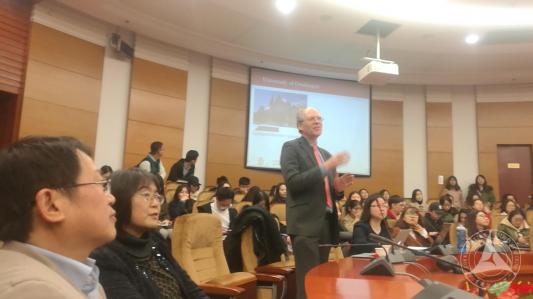 在报告中,贾思珀﹒努斯特教授从三个方面介绍了现代材料科学在纳米尺度的新进展及其应用。首先,他介绍了现代科学的发展促使物理学研究向越来越微观结构深入,而化学往越来越宏观的尺度切入,在物理化学的交叉研究领域,他所在的实验室团队通过不同领域科学家的合作研究,致力于探讨纳米新材料的研发以及在制药、健康、食品、计算机芯片研制等领域的具体应用。第二,他介绍了2016年诺贝尔奖化学奖表彰的三位科学家在“分子机器设计与合成”领域做出的贡献,其中一位科学家伯纳德•费林加正是来自于教授所在荷兰格罗宁根大学,这对推进贾思珀﹒努斯特教授的研究团队致力于纳米新材料的研发是极大的鼓舞。第三,教授特别强调了科学研究过程中的跨学科合作的重要性,也鼓励理工科的同学要多了解哲学、人文和社会科学知识,扩大视野和知识面,并且在科研过程中多与同学、与老师进行交流,在交流过程中发现科学问题和理清研究思路。