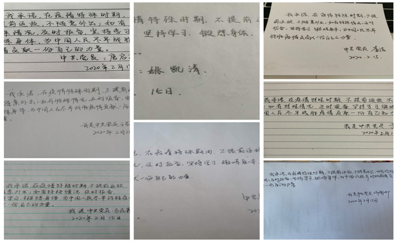 按照支部的部署,寒假中,研究生党员们重温了《论共产党员的修养》,并学习了疫情防护相关知识,视频会议上,党员们依次交流了自己的学习心得,表态要紧跟党中央领导和部署,警惕网上激进言论,发挥员工党员模范带头作用。于金铭向大家介绍了自己在社区做防疫志愿者的经历,号召同学们要在特殊时期关键时刻发挥出共产党员应有的担当精神;姚凯清分享了邻居自觉对电梯进行消毒等暖心行为,温暖了整个会场;李洁谈到人应该与自然界和谐相处,同时对于医护工作者的奉献精神表示崇敬和感动;正在拉脱维亚交换留学的裴泽慧转达了异国朋友对中国抗“疫”的信心,并表示共产党员在这个时候更应该带头坚定自信;祁锦轩鼓励大家积极向身边的人宣传科学的防疫知识,带动周边人正确防疫保护自我。大家都表示在家的日子里要踏实学习不断进步,期待春暖花开回归校园的日子,党员同学们纷纷手写并展示了自己的承诺书。