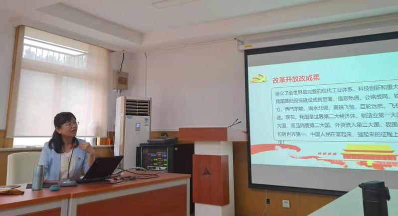 教工第一党支部书记张静敏老师在党课中讲述了“改革开放与‘四史’”、“改革开放四个阶段”、“改革开放重大成就”、“改革开放评价及意义”和“坚持唯物史观,学好改革开放史”五个问题。