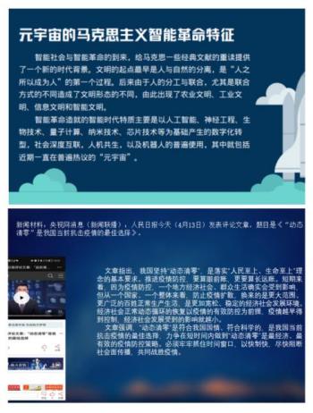电视公司的同学结合党的十八大以来以习近平同志为核心的党中央对党的新闻舆论工作作出的讲话,对马克思主义新闻观的教学传统和实践进行了全方位的分享。数媒网络专业的同学提议借助“元宇宙”虚拟交互的优势开展生动鲜活的党史学习教育,在代入式情境体验中汲取信仰的力量。工商管理专业的同学则运用整体与部分的关系解析我国“动态清零”的科学防疫政策。