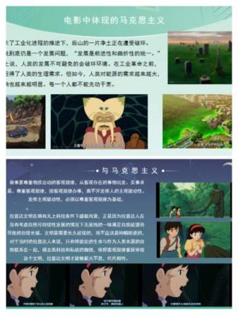 创意视频、影视作品是此次“老员工讲思政课”教学的另一大亮点。同学们联系个人生活,紧贴时代脉搏,彰显传媒特色。电视公司国际新闻与传播班的同学以“马克思主义的诞生过程”为主题制作了一支寓教于乐的双语科普视频,将马克思主义基本原理与传播学理论和国际传播实务进行有机结合。动画专业小组以《天空之城》关于和平与梦想的神奇故事,展现科技、人类和环境和谐发展,表达热爱生活、人与自然和谐共处的理念,由此解读马克思主义哲学的基本观点。