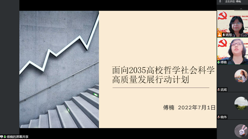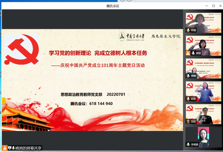 (通讯员 姚旭)为庆祝中国共产党成立101周年,加强党的创新理论学习,2022年7月1日下午,fun88官网体育思想政治教育教工党支部以“学习党的创新理论 完成立德树人根本任务”为主题,以线上方式召开支部党员大会,开展集体理论学习。党支部全体成员参加,马克思主义公司党委书记傅楠作为联系支部党委委员参加了活动,活动由党支部书记姚旭主持。