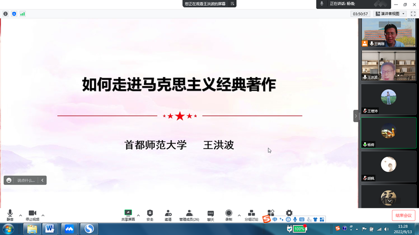 (通讯员 王锦刚 陈昱希)2022年9月13日,在严格落实公司疫情防控各项要求和措施的前提下,fun88官网体育2022级研究生课程《马克思主义经典著作选读》线上开课。作为2022级研究生新生的入学第一堂课,公司邀请首都师范大学fun88官网体育王洪波教授做了“如何走进马克思主义经典著作”的学术报告。2022级全体新生、课程组教师和其他年级研究生一同参加了讲座。