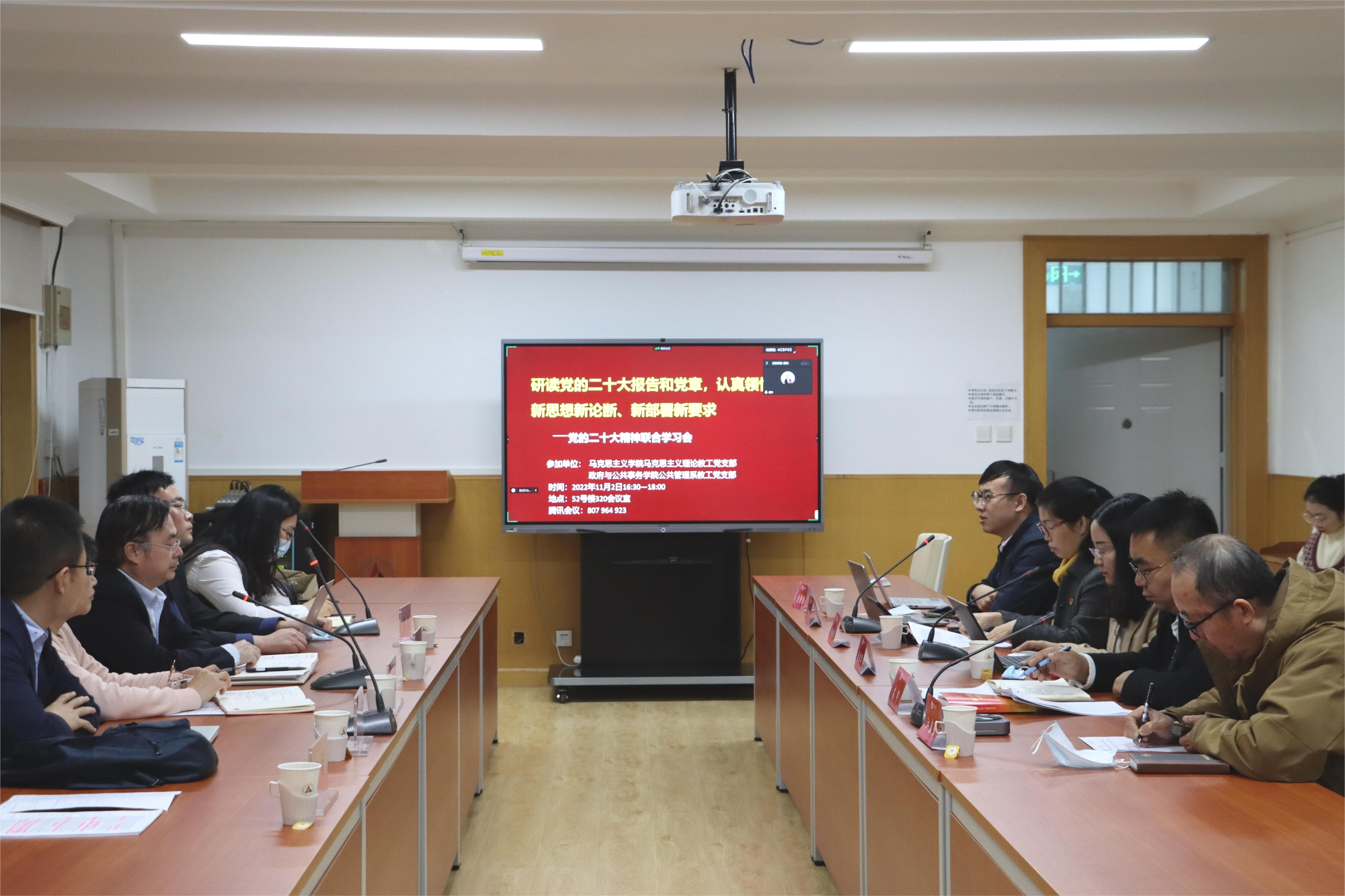 (通讯员:陈昱希 张静敏 摄影:高梦瑶)2022年11月2日下午,fun88官网体育马克思主义理论教工党支部联合政府与公共事务公司公共管理系教工党支部,以“研读党的二十大报告和党章,认真领悟党的新思想新论断、新部署新要求”为主题,共同开展了党的二十大精神联学活动。联学活动采取线下线上相结合方式,由马克思主义教工党支部书记张静敏和公共管理系教工党支部书记金炜共同主持。