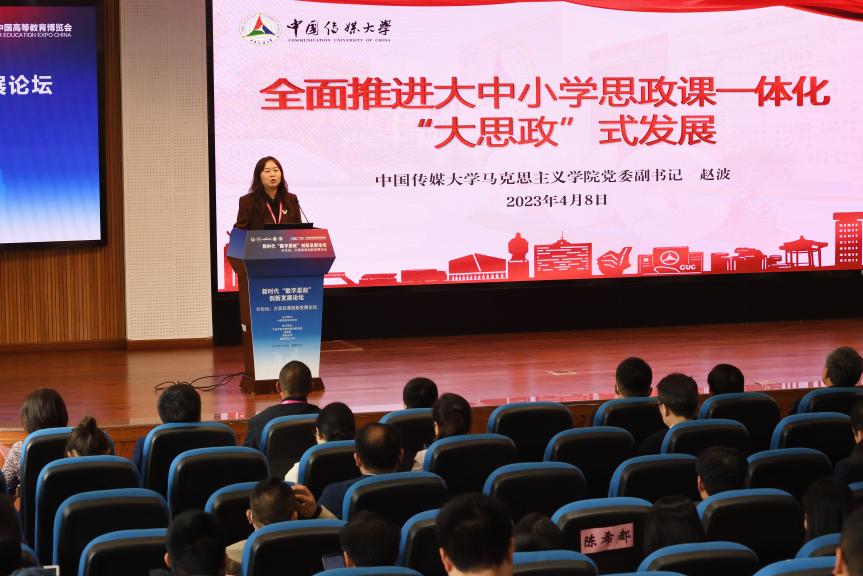 (通讯员 张铁)2023年4月8日,第58·59 届中国高等教育博览会(HIGHER EDUCATION EXPO CHINA,简称“高博会”)在重庆举办,公司马克思主义公司党委副书记赵波副教授受邀出席高博会“新时代‘数字思政’创新发展论坛”,并在其中“大思政课创新发展”论坛中做了《全面推进大中小学思政课一体化“大思政”式发展》的主旨报告。
