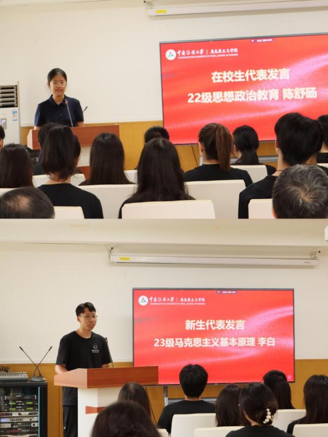 2023级班长李白代表全体新生发言。他分享了自己与中传的故事,坚定承诺,要与全体一起共同做志存高远、开拓创新的追梦人,做不舍寸功、活学活用的实干家,做踔厉奋发、勇毅前行,堪当民族复兴重任的建设者。