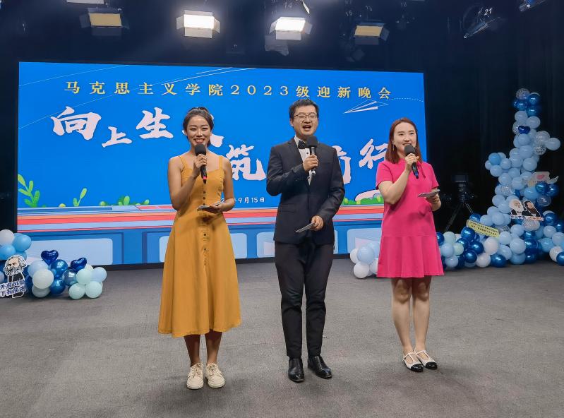 晚会由周围光老师、在校生卜龙妹和新生寸苏丹共同主持,周围光与韩叮咚、钟思雨三位新入职“青椒”登上舞台,与大家分享了踏上思政课教师职业旅程的心声。