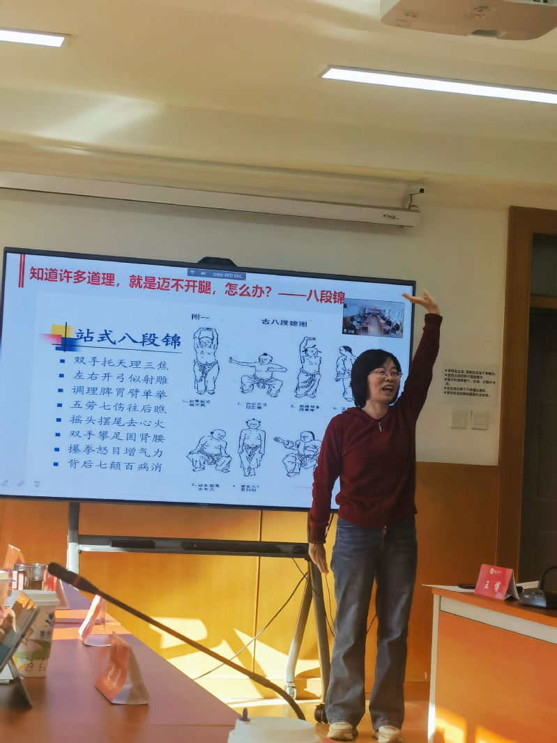 阴老师带领大家现场体验了高能量姿势、深呼吸、正念、八段锦等简单易行的精力管理有效方法,互动气氛活跃热烈。阴老师在生动形象的讲座中引导大家树立了正确的健康观念、运动目的和积极心态,指导老师们学会用科学先进的精力管理方式为身心健康赋能,为生活工作护航。