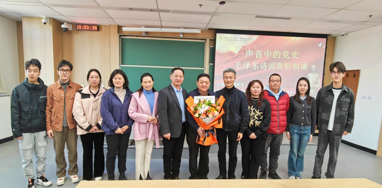 姚喜双教授告诉同学们,“为人民抒写、为人民抒情、为人民抒怀”是毛泽东诗词广为传颂、感人肺腑的根本原因,毛泽东的革命乐观主义是实现伟大梦想、进行伟大斗争、建设伟大工程、推进伟大事业的理想信念,让同学们领略到了伟人毛泽东博大的胸襟。姚老师在讲课中将贯穿于党史发展不同情境的毛泽东诗词信手拈来,灵活自如地将“新民主主义革命的三大法宝”“社会主义建设的初步探索”“中国共产党领导是中国特色社会主义最本质的特征”“中国共产党人的大历史观”等思政课知识要点恰到好处地融合于诗词赏析中。