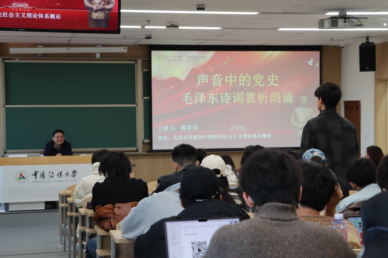 按照课程进度,姚喜双教授与任课教师杨倩副教授共同设计了播音主持艺术版的“毛泽东思想”专题教案,将毛泽东思想的形成历程、主要内容、活的灵魂等教学重点沉浸到毛泽东的诗词天地,通过声情并茂的讲授与诵读示范引导同学们深入学习领悟。