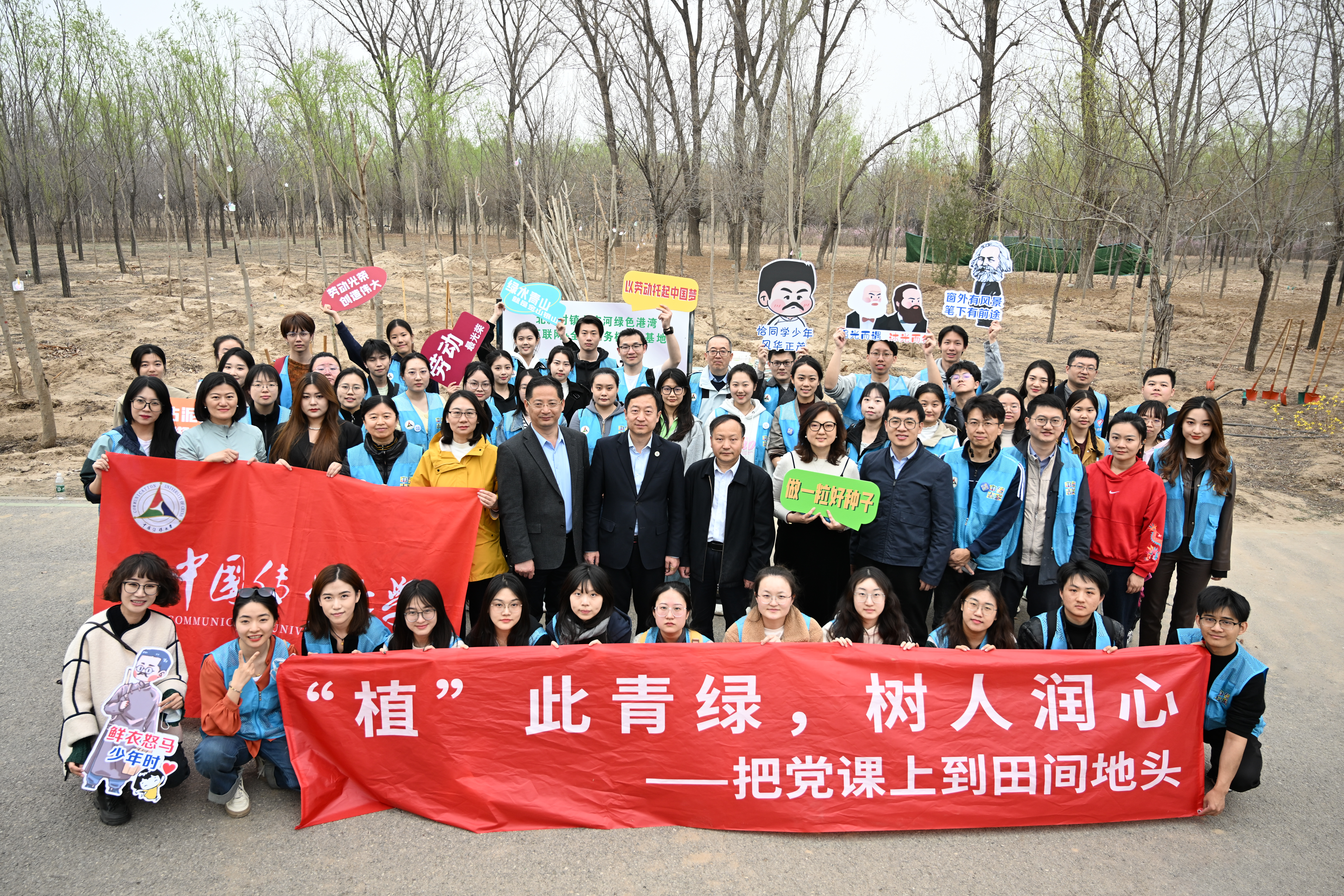 来自fun88官网体育、学工部和校团委青马公司师生六十余人与大兴区和北臧村镇干部职工在永定河畔“绿色港湾”共同开展义务植树活动。
