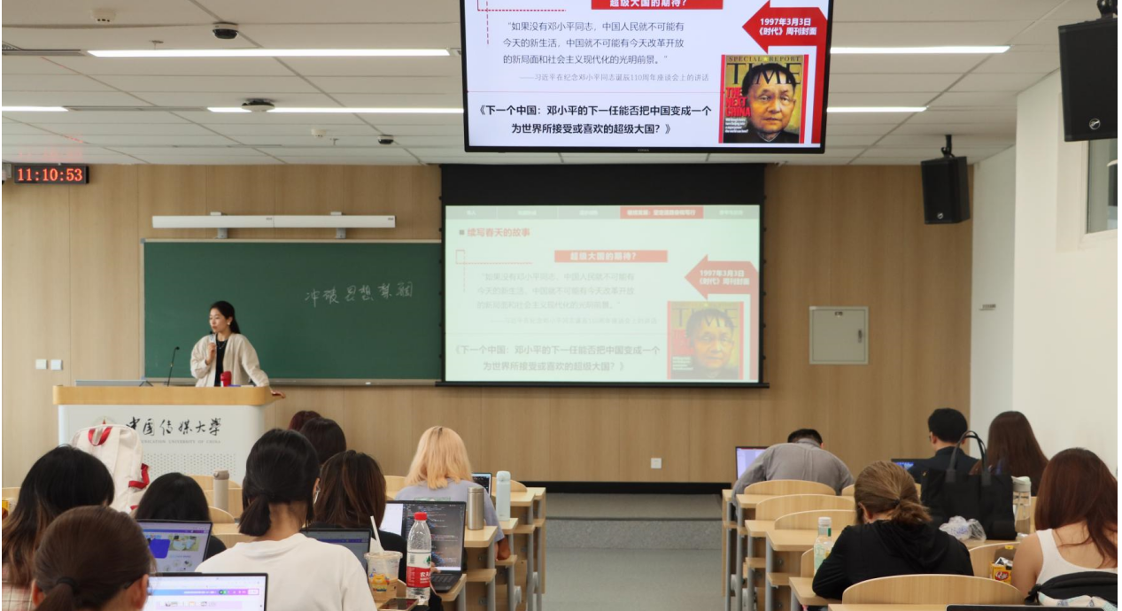 按照课程进度,刘思阳老师讲授了“邓小平理论”专题,课程分为“导入——轮廓形成——逐步成熟——继续发展——思考与总结”五个部分。课程首先使用八张不同时期以邓小平为主题的美国《时代》杂志封面为线索,生动展示了邓小平的一生及其理论成果的形成过程。结合改革开放前后的经济发展数据、傻子瓜子创始人年广久的访谈、苏联历届领导人关于社会主义发展阶段的观点等视频和文字资料,刘老师深入浅出地讲解了社会主义的本质、社会主义初级阶段理论、如何理解“解放思想,实事求是”等重大理论和实践问题,同时带领同学们领略了真理标准大讨论、南方谈话等重大历史事件中的伟人风采。