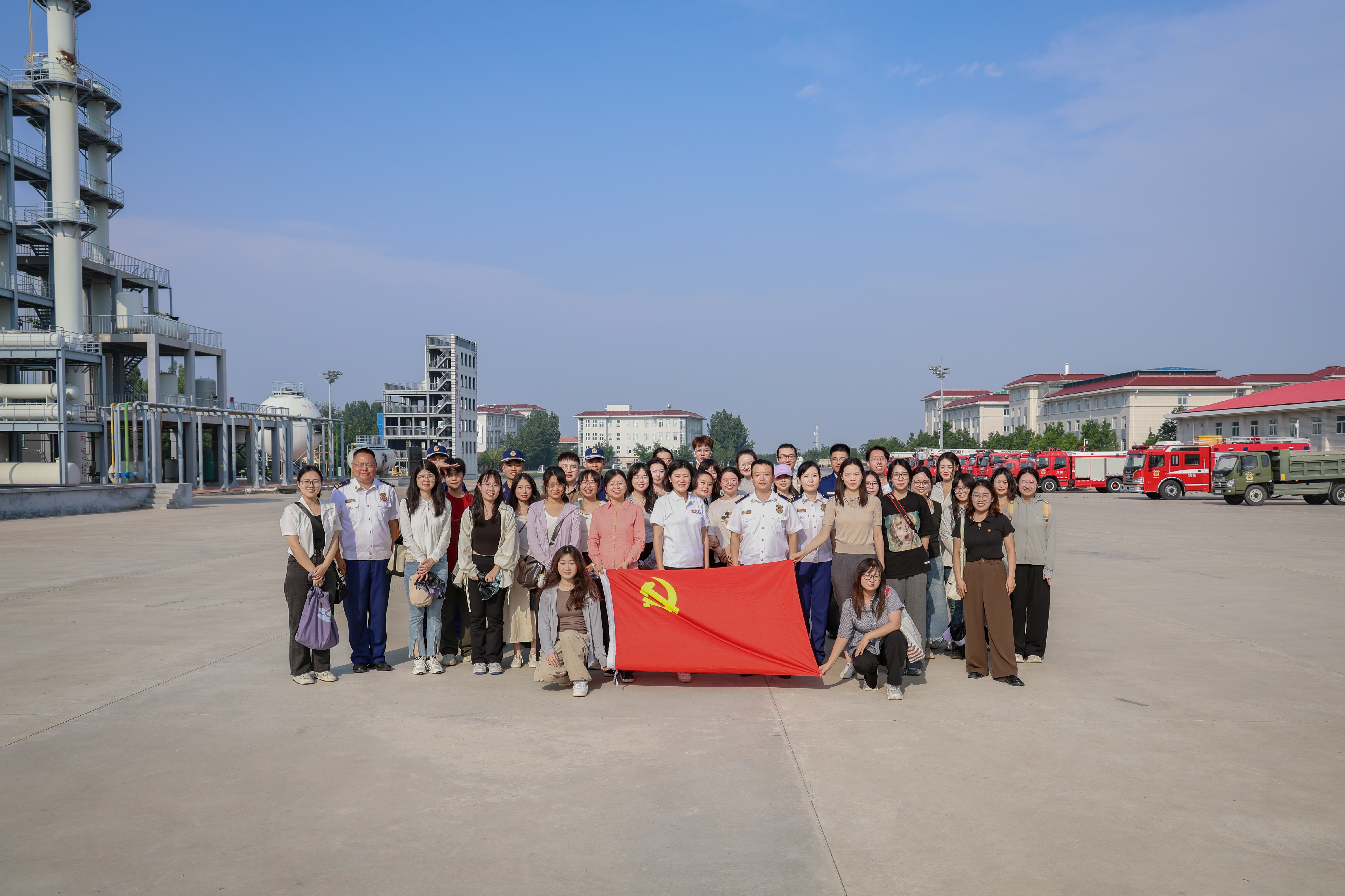 整齐停放的消防车辆、多功能绳索训练塔、化工训练设施、地震救援训练等设施让同学们大开眼界。