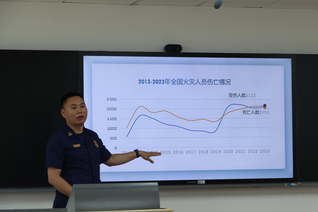 随后,消防工程系范维松教授以“筑牢安全‘防火墙’ 防灾防患于‘未燃’”为题为师生进行消防安全专题辅导讲座,从火灾是如何发生的、发生了火灾怎么办和如何预防火灾三个方面,辅以详实的数据图表和视频资料,给大家上了一堂科员工动的消防安全教育课。