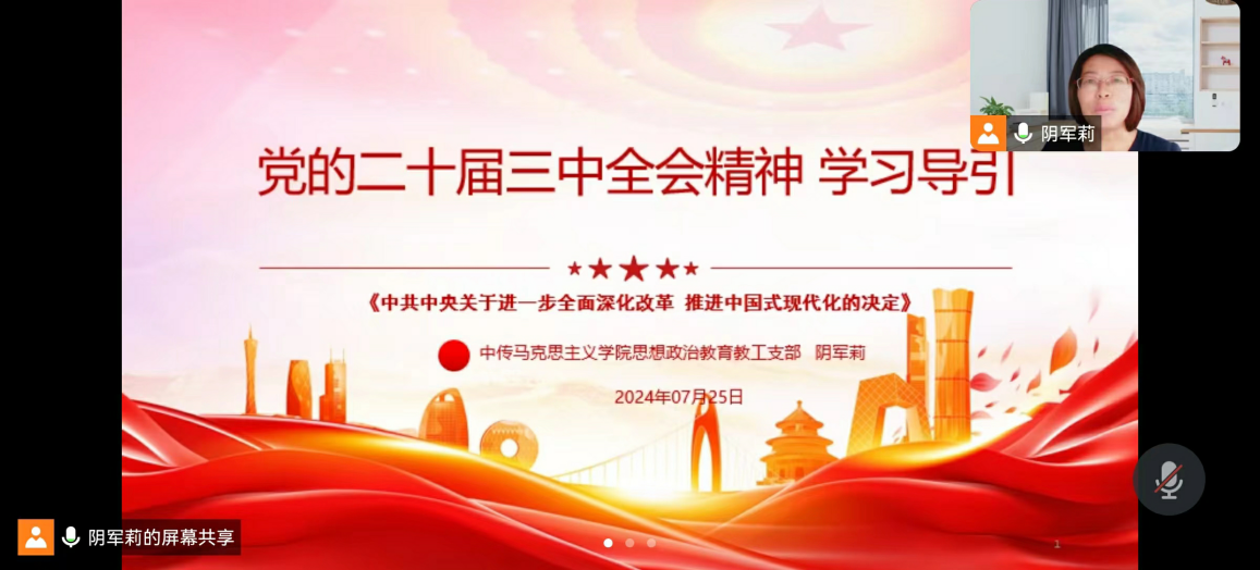 (通讯员 周围光)2024年7月25日,fun88官网体育思想政治教育教工党支部举行党的二十届三中全会精神集体学习会。本次学习在线上开展,由党支部书记阴军莉主持并领学,支部全体党员教师参与了本次学习。