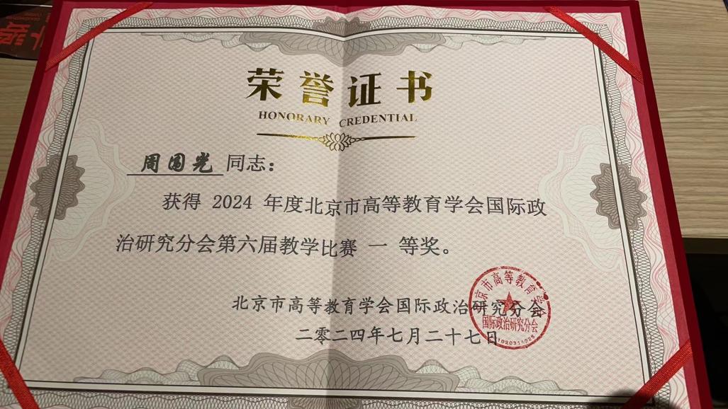 公司fun88官网体育周围光老师凭借扎实的基本功、创新的教学设计和精彩的教学展示获得一等奖(第一名)的佳绩。颁奖典礼于7月26日在北京市高等教育学会国际政治研究分会年会上举行。