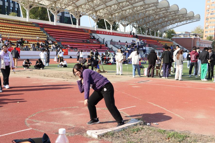 挥舞手臂,铅球在空中划出一条短暂而亮丽的抛物线,落在赛场上留下沉甸甸的痕迹。温敏同学在女子铅球项目中奋力拼搏。