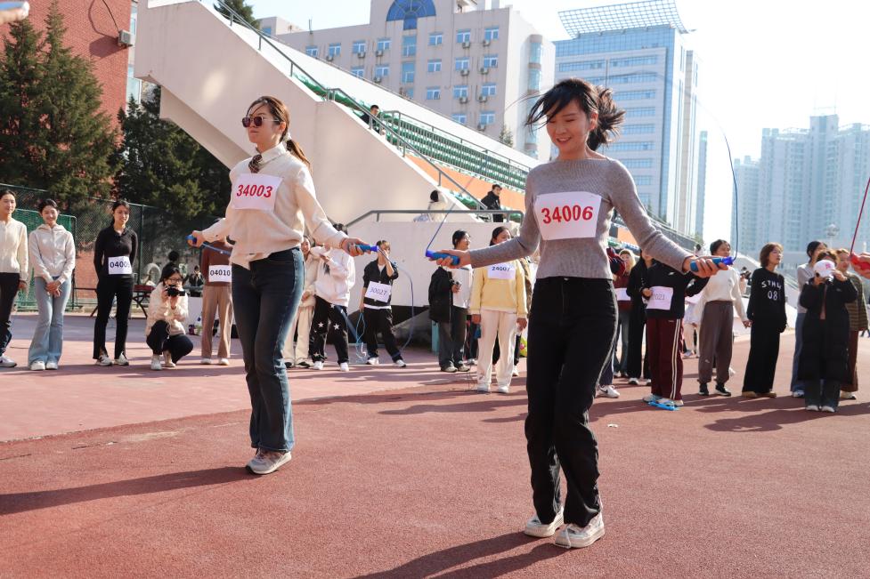 细绳飞舞, 如旋风般在操场上空划过一道道优美的弧线。尹书敏、李丹丹同学在女子跳绳项目中,轻盈跃动, 尽显风采。