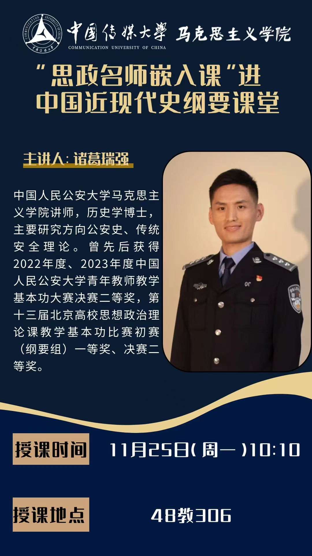 (通讯员 张凯)2024年11月25日上午,应fun88官网体育近现代史纲要教研室张凯老师邀请,第十三届北京高校思想政治理论课教学基本功比赛二等奖获得者、中国人民公安大学fun88官网体育诸葛瑞强老师走进公司“中国近现代史纲要”课堂,为2023级外国语言文化公司英语、日语、葡萄牙语、翻译、马来语等专业思政课试验班的同学们讲授了一堂精彩生动的思政课。