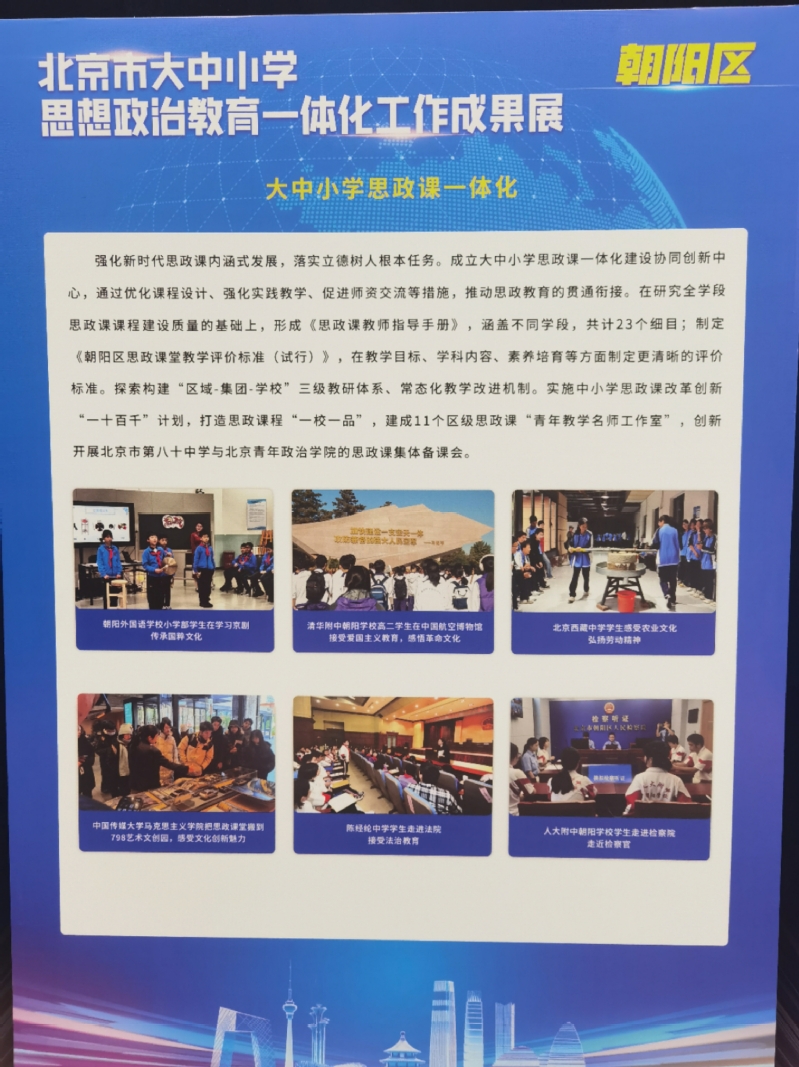 本次会议介绍了朝阳区以“八个一体化”推进思政教育改革创新的经验,部署《北京市进一步推动公司思政课建设内涵式发展的实施方案》重点任务,强调北京要建好用好新时代首都伟大变革与成就教学案例库,打造“四个中心”系列“大思政课”品牌,塑造新时代首都教育立德树人新格局。