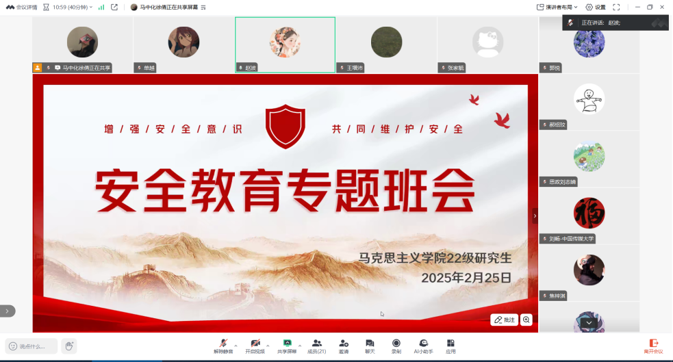 2022级研究生班以“加强毕业生安全意识,护航毕业季”为主题,于2月26日召开了线上班会。班主任赵波老师主持班会,重点从消防安全、网络安全、心理健康和公共卫生安全四个方面向毕业班同学开展安全教育。赵波老师结合校内外消防安全案例向大家强调了公司的禁烟规定,要求同学们自觉自律禁止私拉乱接电线、杜绝违规使用大功率电器、爱护消防设施等,提醒同学们通过多种渠道掌握应急自救常识;在网络安全教育方面,赵波老师强调,马院学子应充分发挥自身理论优势,增强网络安全辨别能力,注意网上信息安全,谨防网络诈骗,使用正版软件,严守伦理底线和法律边界,不造谣不传谣,对自己的言行负责;临近毕业季,同学们的心理压力和焦虑感与日俱增,对此,赵波老师提醒同学们合理疏解压力,善用公司和公司的心理护航保障资源,牢记自己并非孤军奋战,鼓励班集体凝心聚力营造温暖支持的氛围;面临换季流感高发,赵老师提醒同学们养成良好生活习惯,做好防护,身体不适及时就医,保持宿舍卫生,对自己负责,对集体负责。