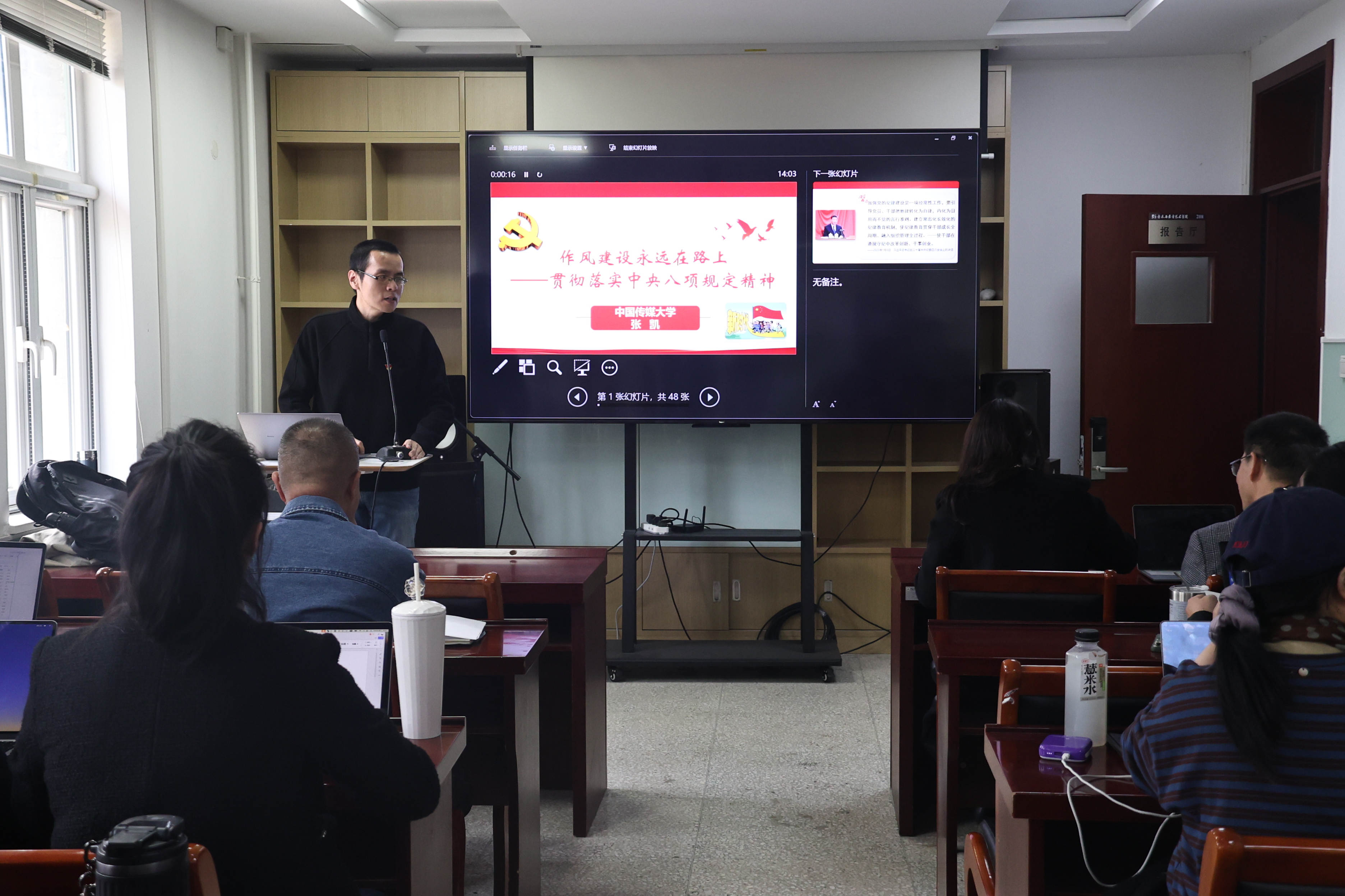 在主要内容方面,张凯老师分别就“八项规定和八项规定精神是什么”“八项规定和八项规定精神的适用人群范畴”“违反八项规定精神的类型表现”和“十八大以来深入贯彻八项规定精神的成效”进行分享学习。