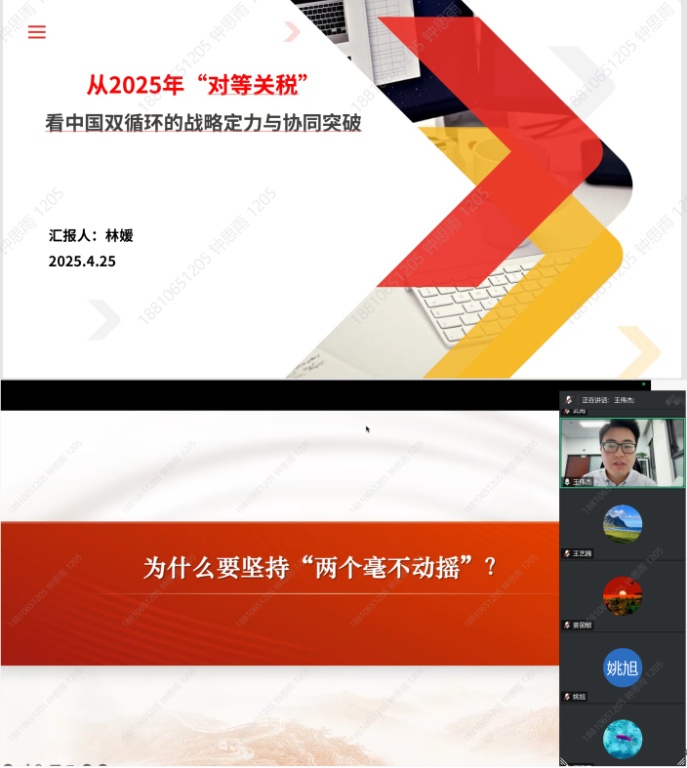 案例研讨环节,公司林媛老师以“从2025年‘对等关税’看中国双循环的战略定力与协同突破”为题,上财马院王伟杰以“为什么要坚持‘两个毫不动摇’”为题分别进行分享。两位老师的分享交流,与时俱进地将习近平经济思想融入教学内容,又以独具地域高校特色案例实现员工的“身边事”与国内国际的“天边事”有机融合。