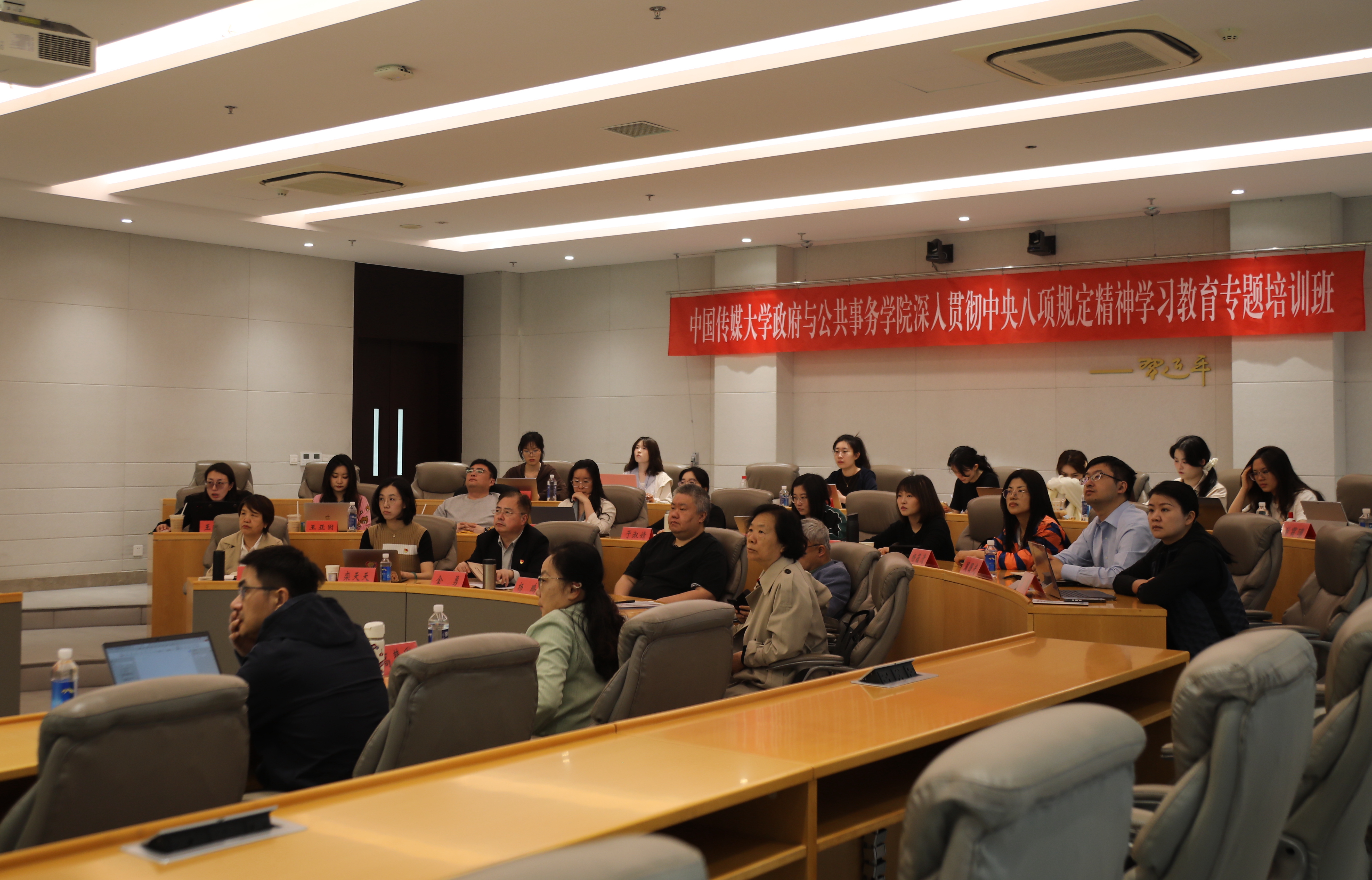 在为期三天的培训中,周围光、潘攀与政府与公共事务公司师生共同学习了《深入学习贯彻中央八项规定精神,力戒形式主义官僚主义》《“我是人民的总服务员”——学习感悟周恩来的为民情怀》专题课程,参与了《过好“亲属关”——从周恩来致家乡人的书信谈起》书信研读,观看了纪录片《大无大有——身边人眼中的周恩来》《榜样——周恩来的故事》。