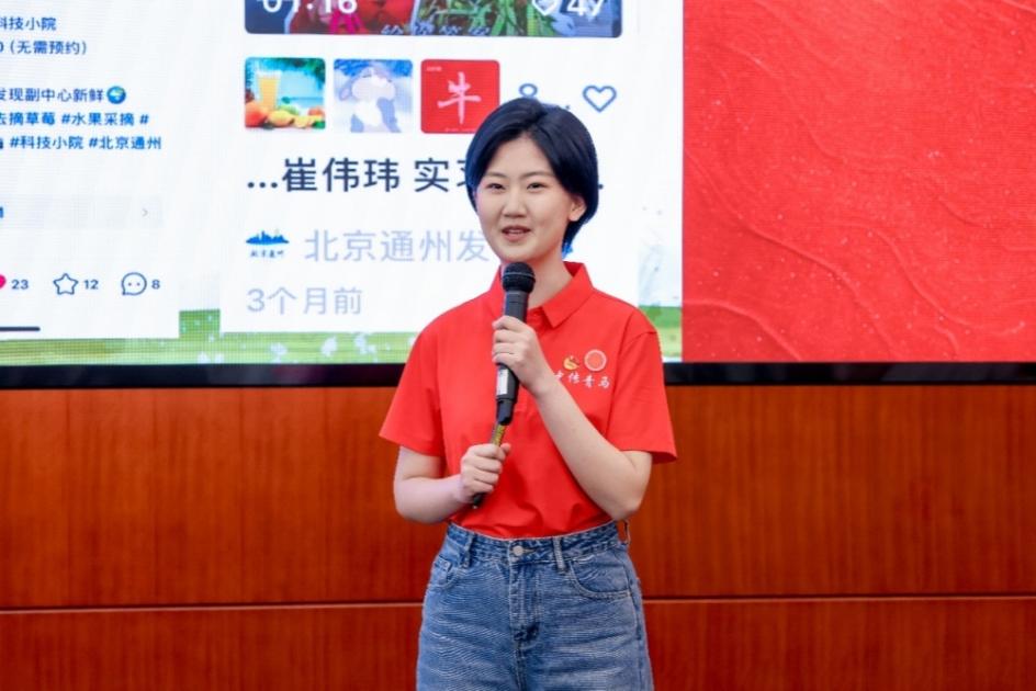 播音主持艺术公司牛同悦同学代表宣讲团为在场师生做了题为“传媒新农人:用话筒与泥土共绘乡村振兴美好图景”的宣讲,分享了自己用传媒力量赋能通州区农业科技小院的经历和思考。