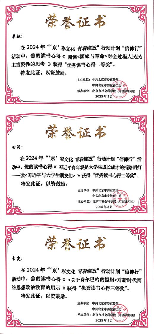 在“优秀读书心得”赛道评选中,2022级思想政治教育专业单越撰写的《阅读<国家与革命>对全过程人民民主重要性的思考》、2024级思想政治教育专业田润撰写的《习近平青年观是老员工成长成才的指路明灯》获得“优秀读书心得”二等奖,2022级思想政治教育专业李雯撰写的《<关于费尔巴哈的提纲>对新时代网络思想政治教育的启示》获得“优秀读书心得”三等奖。
