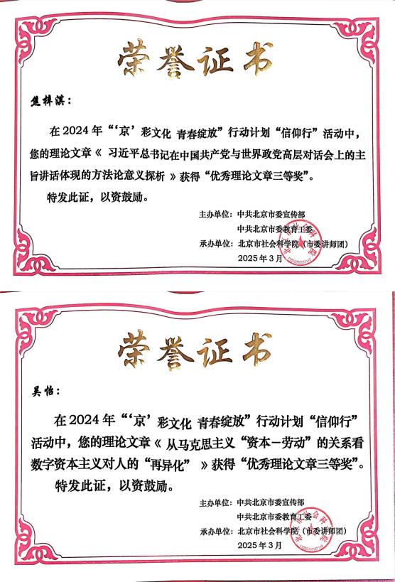 2022级思想政治教育专业焦梓淇撰写的《习近平总书记在中国共产党与世界政党高层对话会上的主旨讲话体现的方法论意义探析》、2022级思想政治教育专业吴怡撰写的《从马克思主义“资本-劳动”的关系看数字资本主义对人的“再异化”》获得“优秀理论文章”三等奖。