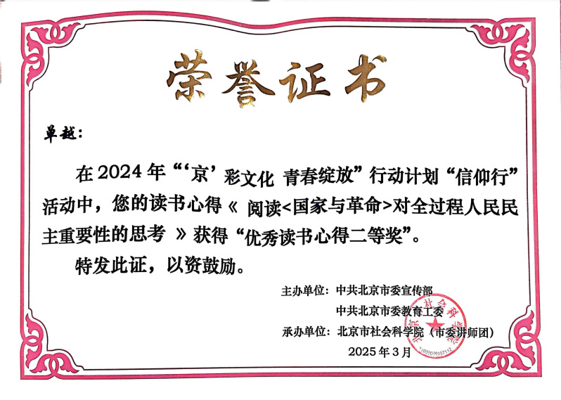 (通讯员 吴怡 田润)由市委宣传部、市委教育工委、北京市社会科公司(市委讲师团)联合主办的2024年“‘京’彩文化 青春绽放”行动计划之“信仰行”系列活动圆满落幕。此次活动旨在以首都深厚的文化底蕴滋养青年成长,引导青年学子积极投身全国文化中心建设,在文化传承与时代新人培养中迈出坚实步伐。fun88官网体育学子积极参与,共提交参赛作品15篇,近日,活动评奖结果正式公布,公司9篇作品荣获奖项,成绩斐然,充分展现了青年学子的思想深度与人文素养。