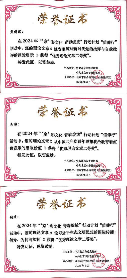 2022级思想政治教育专业焦梓淇撰写的《延安整风对新时代党的批评与自我批评的经验启示》、2022级思想政治教育专业吴怡撰写的《从中国共产党百年思想政治教育看红色音乐的思政价值》、2022级马克思主义中国化专业赵迪撰写的《论习近平生态文明思想的国际传播:何为、为何与如何》获得“优秀理论文章”二等奖。
