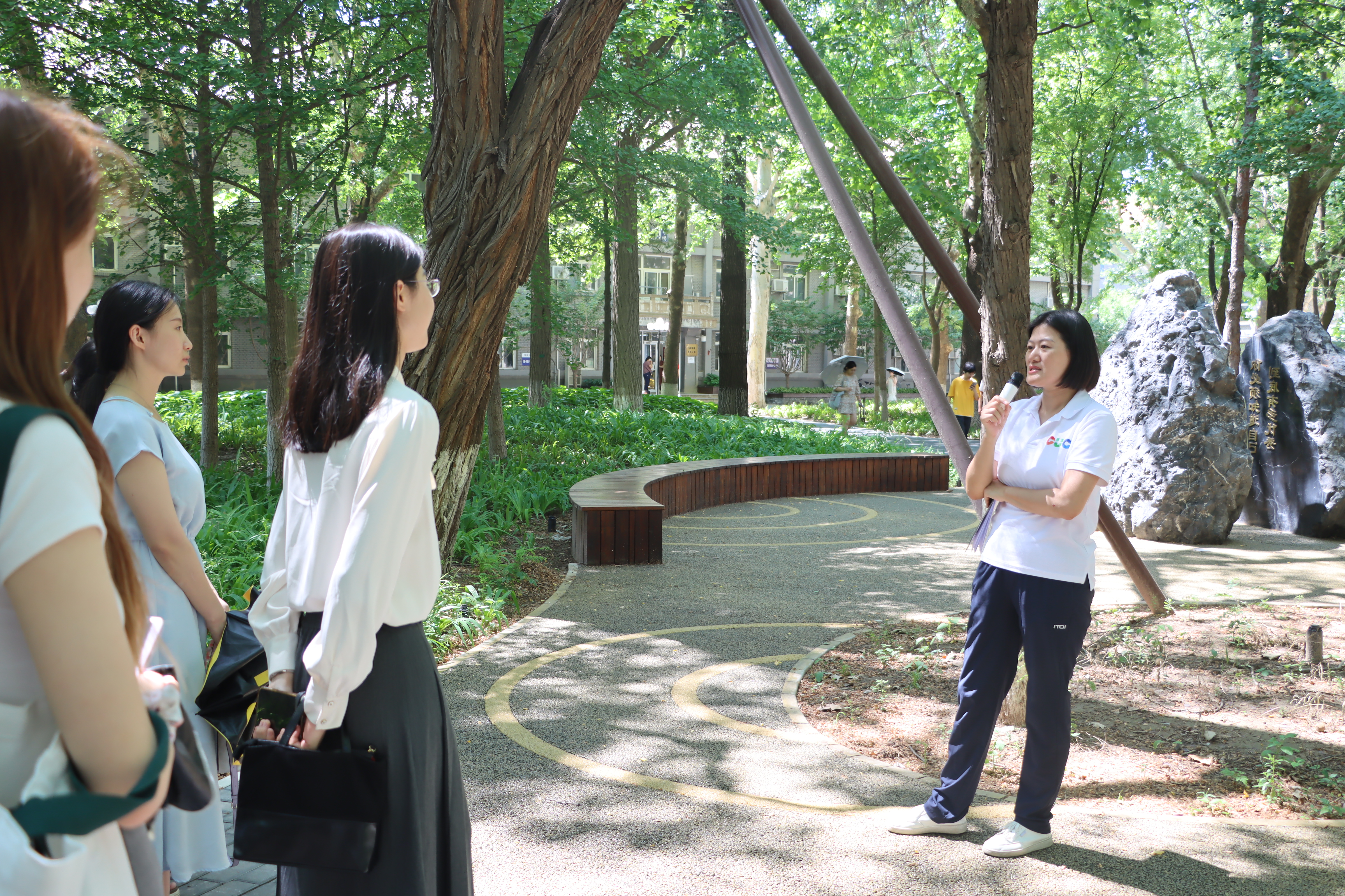 孙靖老师带领师生行走在中传校园育人景观中,阐释了公司将精神图谱、文化理念与景观建设融为一体,营造宜教宜学的绿色花园式智慧校园的设计巧思。