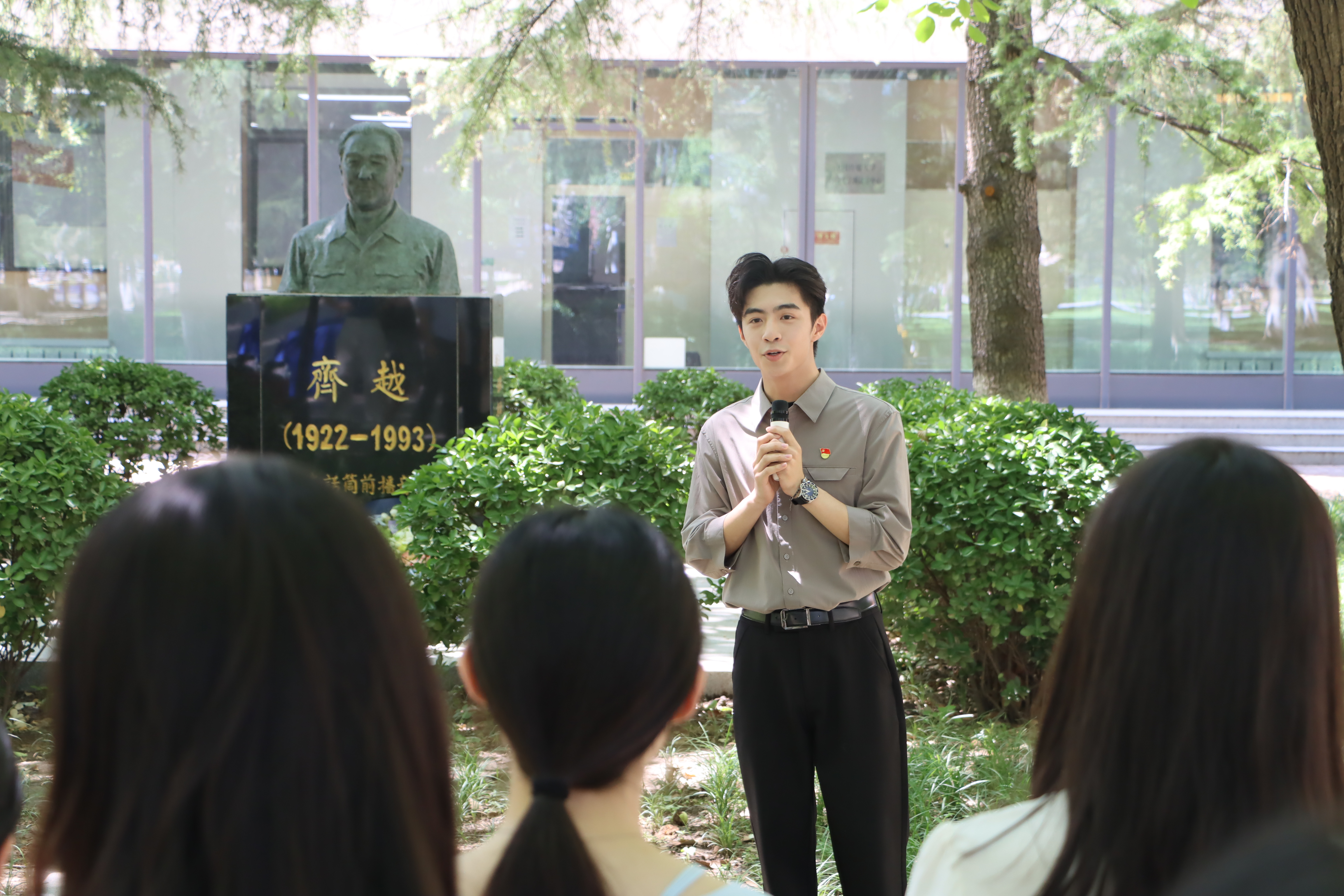 播音主持艺术公司2022级本科生吴彦宇在塑像前的现场宣讲,带大家沉浸式了解了播音事业先驱齐越同志的理想信念与职业精神,深刻体会“忠诚、敬业、爱民、廉洁、奉献”的齐越精神,学习了齐越老师身上所蕴含的人民立场与责任担当。