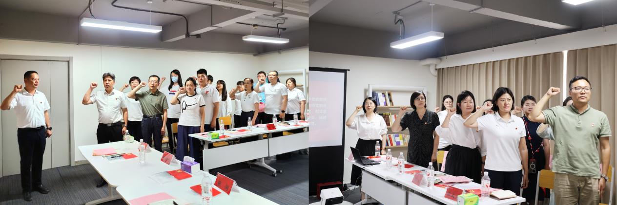 活动进入第三环节,刘东建书记带领全体党员重温入党誓词,孙靖副书记领唱《没有共产党就没有新中国》。