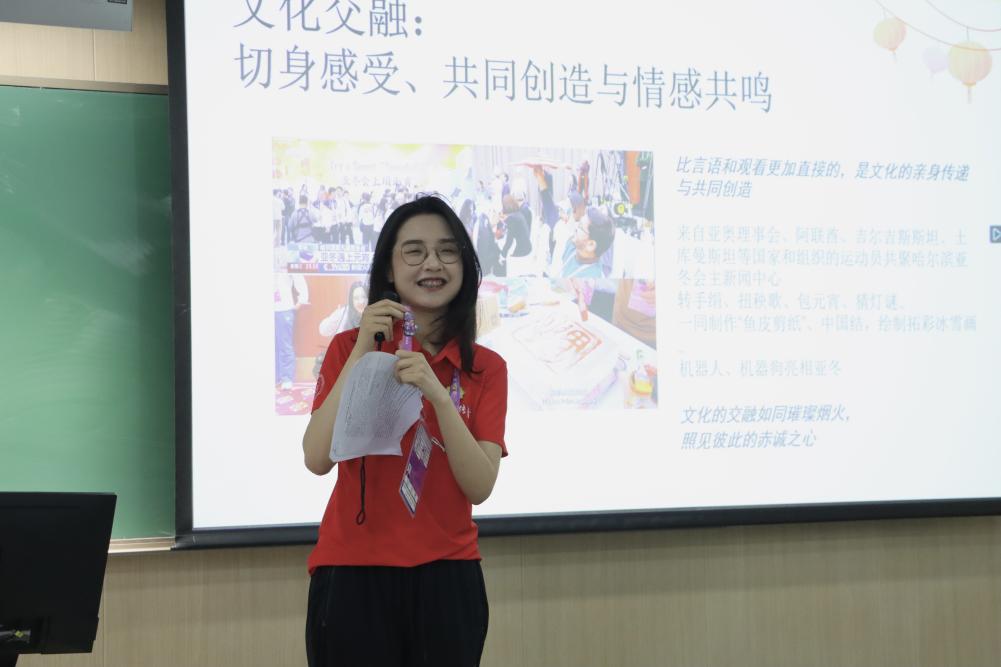 赵珮伊以“体育精神与中国青年的国际表达”为主线,串联起运动员生涯与国际赛事实践的双重经历。从省队训练场的汗水挥洒,到亚运会、亚冬会的志愿服务,她以“体育传播者”的视角解读文化交流,并通过科技技术向国际友人展示体育文化的数字化传承。赵珮伊同学现场展示的与中外青年交流照片,生动诠释了“以体育为桥,让世界看见中国”的青春使命。