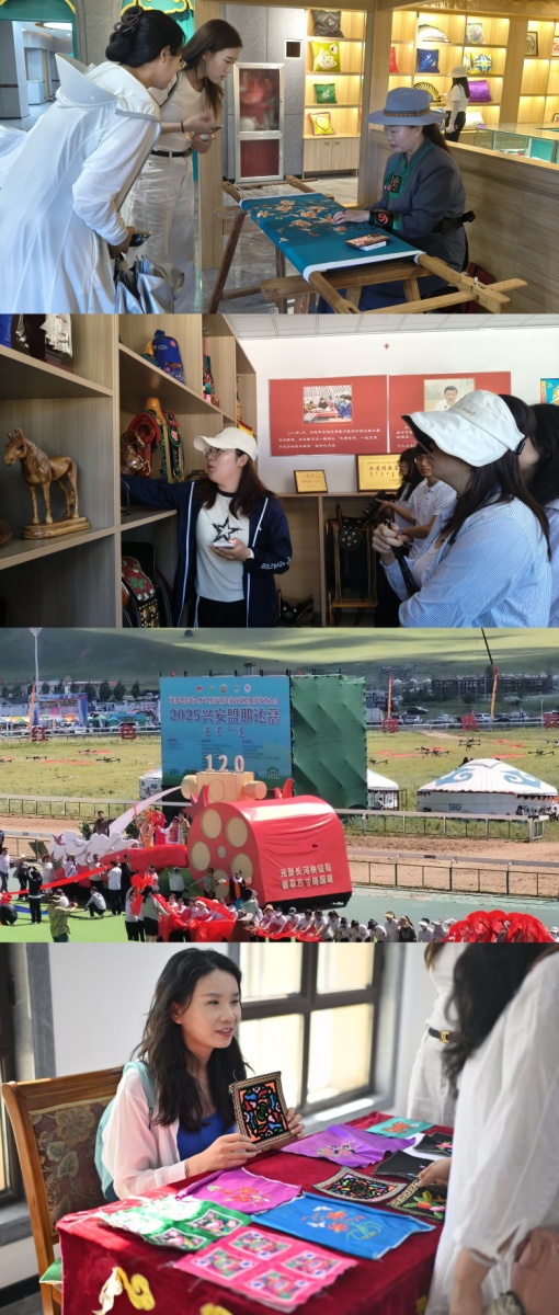 团队在实践中深入感受民族文化传承与创新。在兴安盟那达慕,体验传统体育竞技与文旅融合的创新实践;走访萨日朗巾帼民族专业合作社与熬力斯台民族手工艺品公司,调研札萨克图刺绣与马鞍制作两项非遗技艺的活态传承与现代转型;考察乌兰毛都草原宿集,探讨高端民宿带动文化传播与消费升级的模式,体悟“绿水青山就是金山银山”的深刻内涵。
