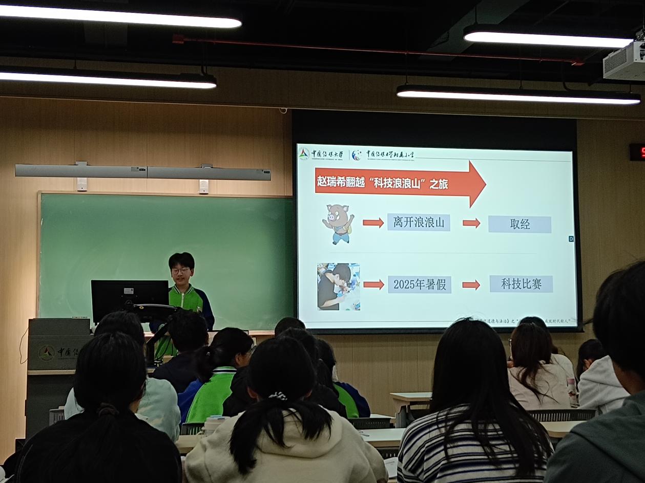 赵瑞希以《翻越“科技浪浪山”之旅》为题,讲述了自己与团队研发“智慧阅伴——阅读理解AI伙伴”的经历,表达了“用科技遇见不一样的自己,用科技报效祖国”的志向。