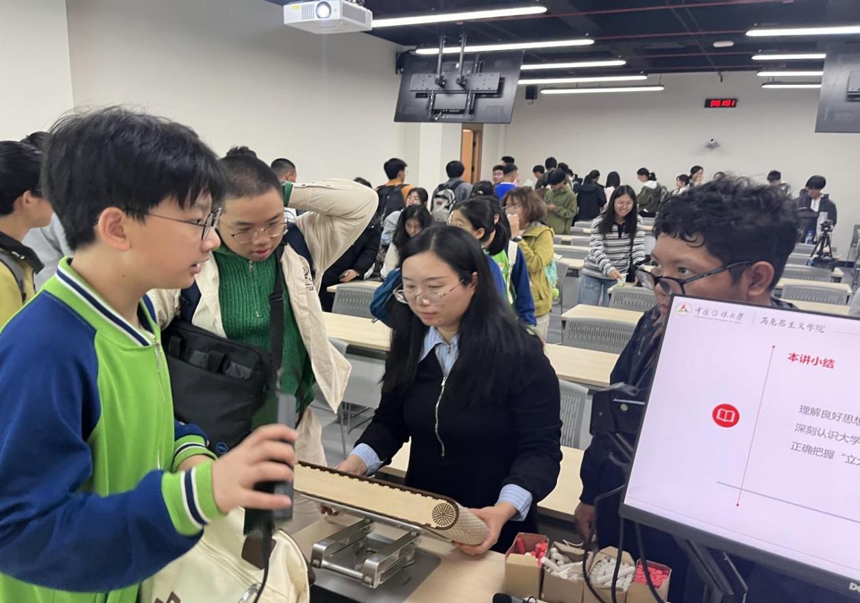 课堂教学分为三个环节。刘洁老师依据课程大纲、教学进度、教材体系及重难点分析,首先阐述了中国特色社会主义进入新时代的伟大意义,引导同学们深刻认识青年在实现中华民族伟大复兴中的历史使命,正确理解和把握当前的人生际遇与挑战,尤其聚焦传媒领域人才“以专业优势服务国家战略”的责任担当,思考如何做到“辨方位以正则”。