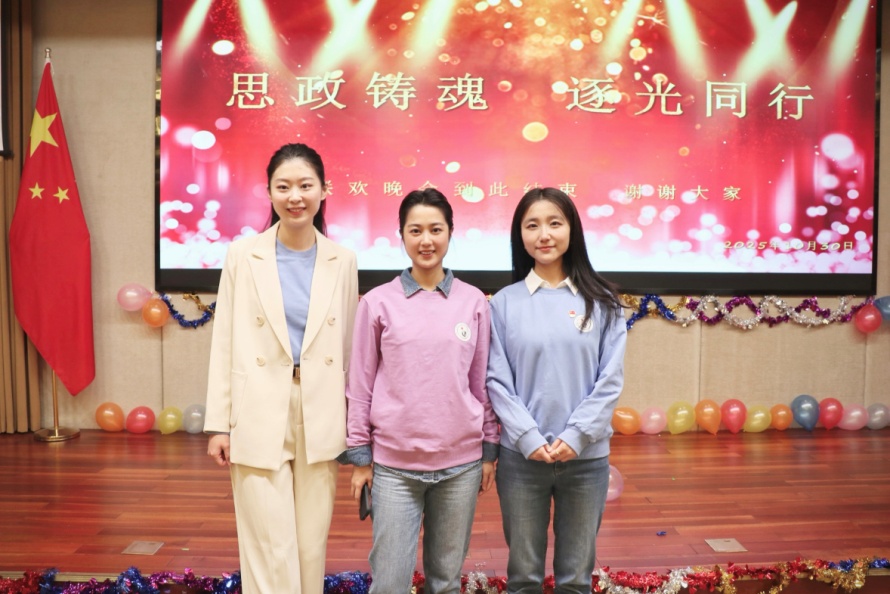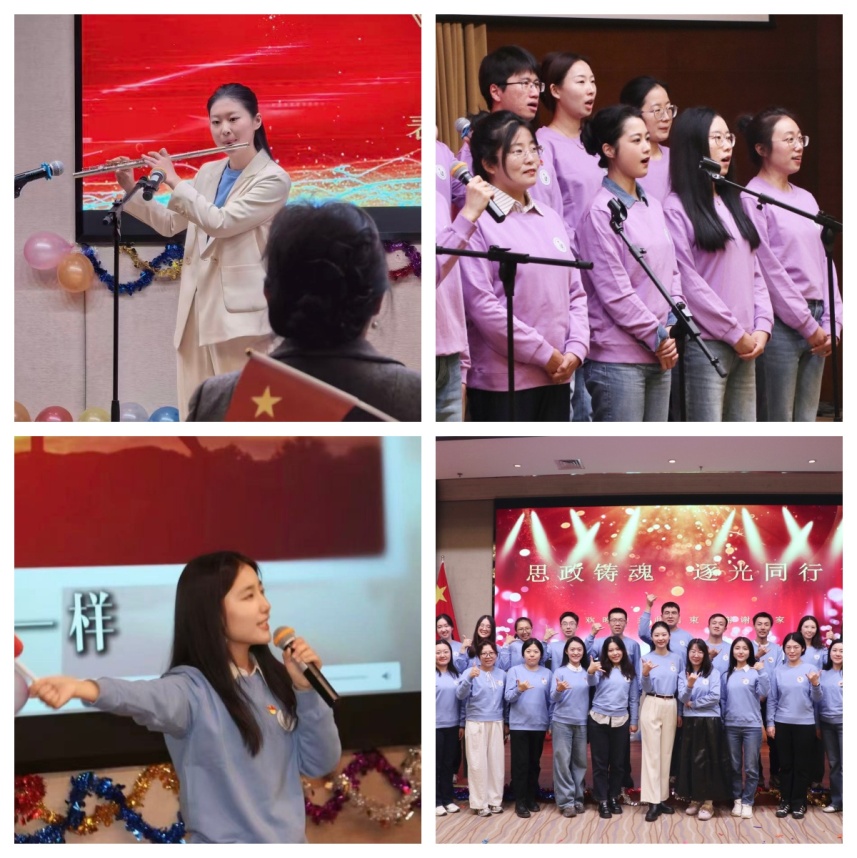 在研修班“思政铸魂 逐光同行”联欢晚会上,三名教师更是各展所长、绽放光彩。王雨萧担任晚会主持人,以从容台风把控全场流程,用鲜活串词串联各环节,同时带来长笛独奏“乐曲串烧”,并担任第一组合唱指挥,全方位展现综合才艺;郭家瑞参与第二组合唱,以饱满热情演唱《没有共产党就没有新中国》《团结就是力量》等经典曲目,富有感染力的歌声带动全场氛围,传递深厚爱国情怀;贾晰既参与第一组《强军战歌》《当那一天来临》合唱表演,又独唱《和你一样》,以温暖歌声诠释“师生同心、携手共进”的育人理念,引发全场共鸣。