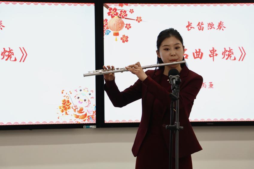 青年教师王雨萧多才多艺,一曲技艺精湛的长笛独奏《名曲串烧》征服了全场,悠扬旋律在会场中流淌,带领大家走进纯净美妙的古典音乐世界。