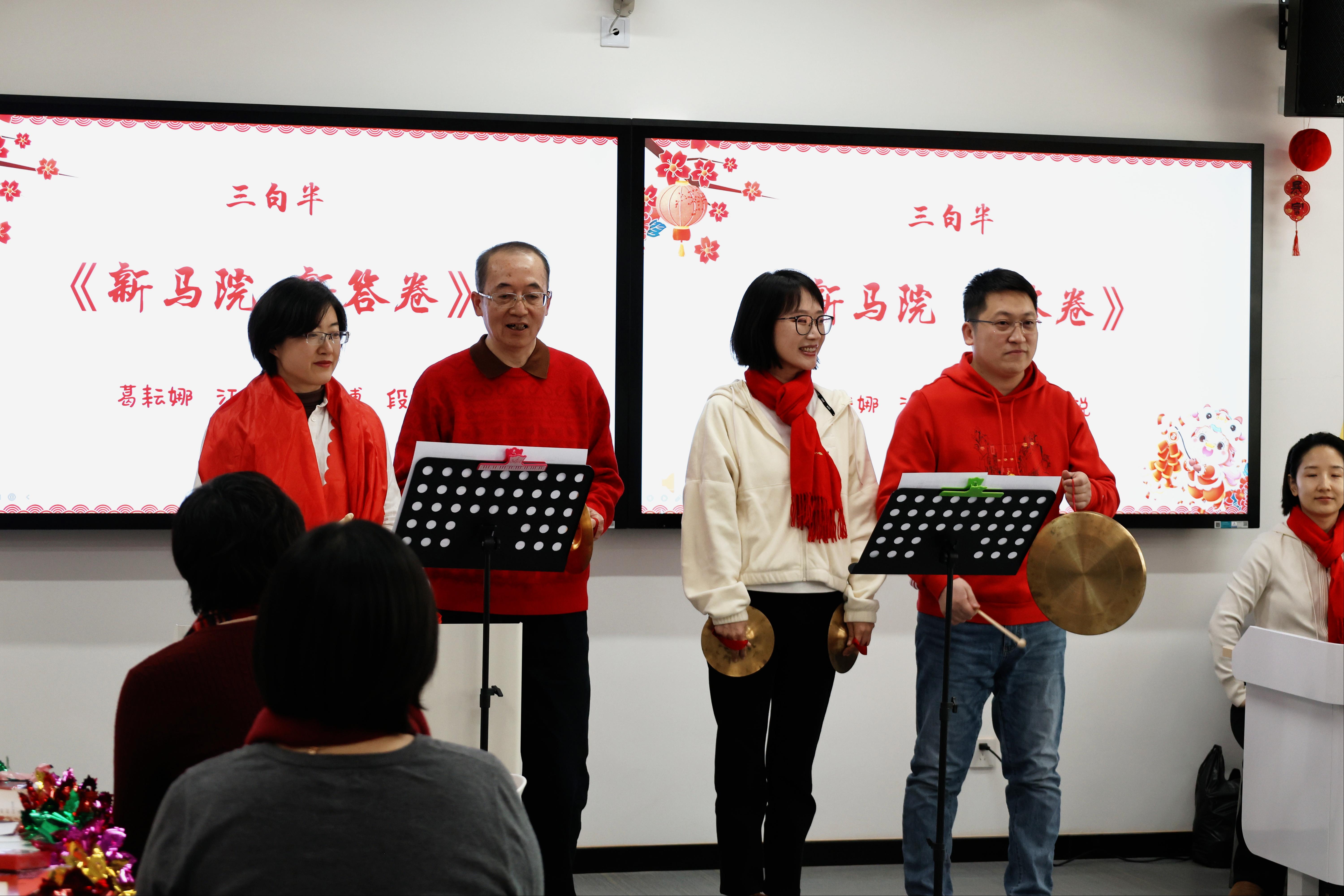 公司传统保留节目、原创三句半《新马院 新答卷》由江春鸣、葛耘娜、段锐、王博四位老师精彩呈现。整齐押韵的台词、精妙诙谐的表达,生动展现了公司发展新貌,字里行间皆是团结奋进的精气神。