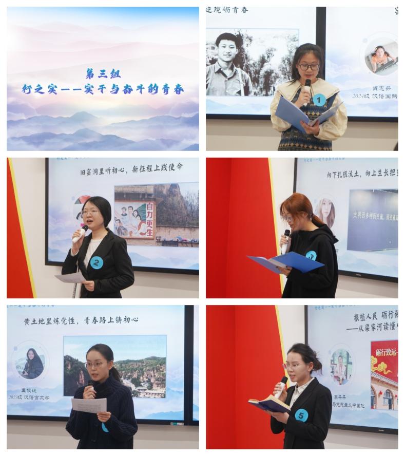 第三组选手肖惠芳从总书记“过四关”的智慧中感悟到了新时代“过四关”的启示;尹如锦同学虽因韧带拉伤行动不便,仍坚持到场参赛,以《旧窑洞里听初心,新征程上践使命》为题,用铿锵的言语展现了坚韧不拔的意志品质和对初心信念的执着追求,其精神风貌令人动容;孙睿聪同学在《向下扎根沃土,向上生长担当》的演讲中,巧妙联系自己的汉语国际教育专业,分享了如何将“扎根中国大地”的感悟融入未来向世界讲述中国故事、传播中华文化的使命之中,视角独特,体现了深刻的学思践悟;孟俊婕同学感悟总书记在艰苦环境中磨砺意志、扎根群众、实干担当的宝贵品质;李丹丹同学认为《习近平的七年知青岁月》是一部青春奋斗的史诗,更是一场深刻的生命洗礼,她的演讲带领现场老师同学们一起穿越时空,回到那段艰苦却充满光辉的岁月,共同探寻青年习近平在梁家河的成长足迹。选手们循着领袖足迹悟初心、以实干担当践使命,尽显新时代青年的坚定信念与昂扬风貌。