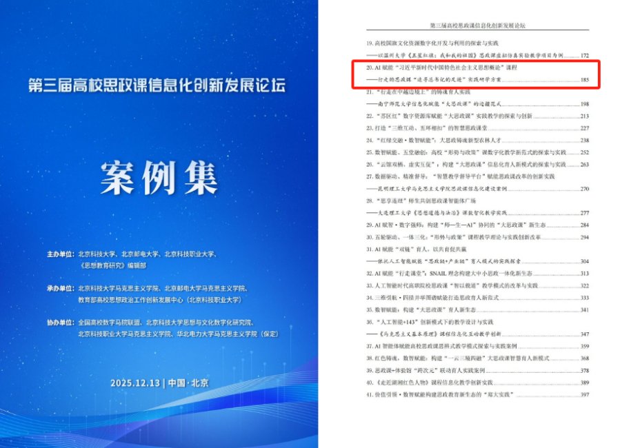 在此基础上形成的“AI赋能‘习近平新时代中国特色社会主义思想概论’课程——行走的思政课‘追寻总书记的足迹’实践研学方案”,成功入选由北京科技大学、北京邮电大学、《思想教育研究》编辑部等单位主办的第三届高校思政课信息化创新发展论坛案例集。