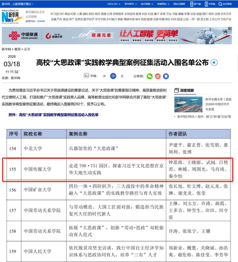 两项成果的入选,集中体现了公司习近平新时代中国特色社会主义思想概论教学团队在思政课改革创新中的战略思维与行动自觉。这不仅是团队深耕思政课“一研究”的阶段性成果,更是公司以学科特色赋能立德树人、以改革创新回应时代命题的生动缩影。未来,团队将深耕思政课教学改革,依托跨校备课、诊断磨课、学情调研、实践研学的常态化集体教研模式,着力打造“习近平新时代中国特色社会主义思想概论”课程互动式教学案例集及“一师一课”项目,为推动思政课课堂教学方式创新、新时代思政课高质量发展贡献中传智慧与力量。